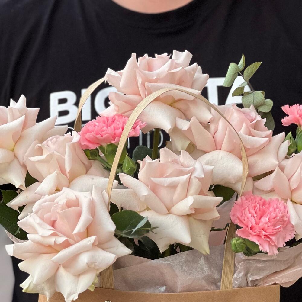 Евро-Букет из Роз,Диантусов и Эвкалипта + открытка ручной работы в подарок в Кулебаках